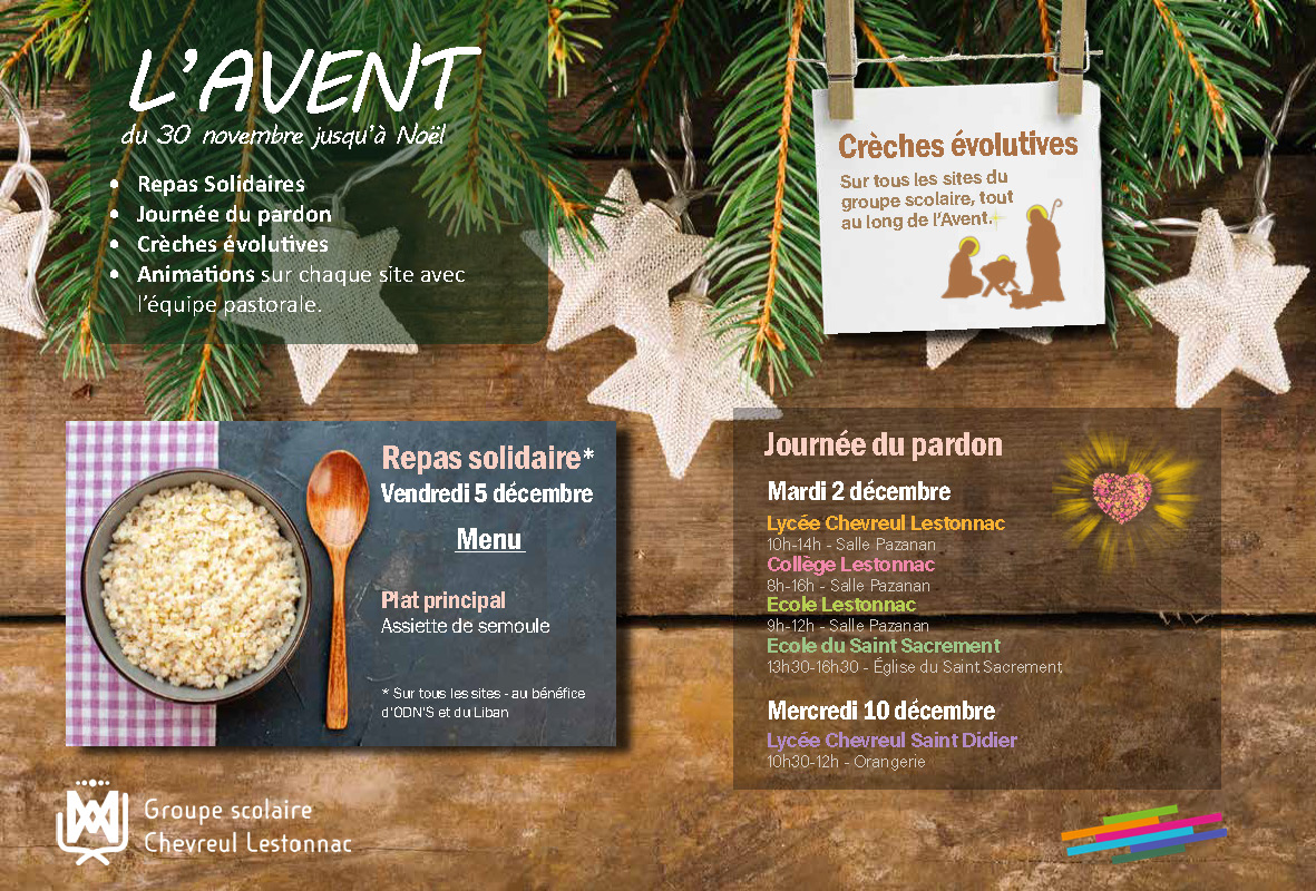 • Mercredi 10 décembre : rencontre /réconciliation. Les élèves qui le souhaitent peuvent échanger avec un prêtre et recevoir le sacrement de la réconciliation à l’Orangerie, entre 10h30 et 12h, sur inscription.