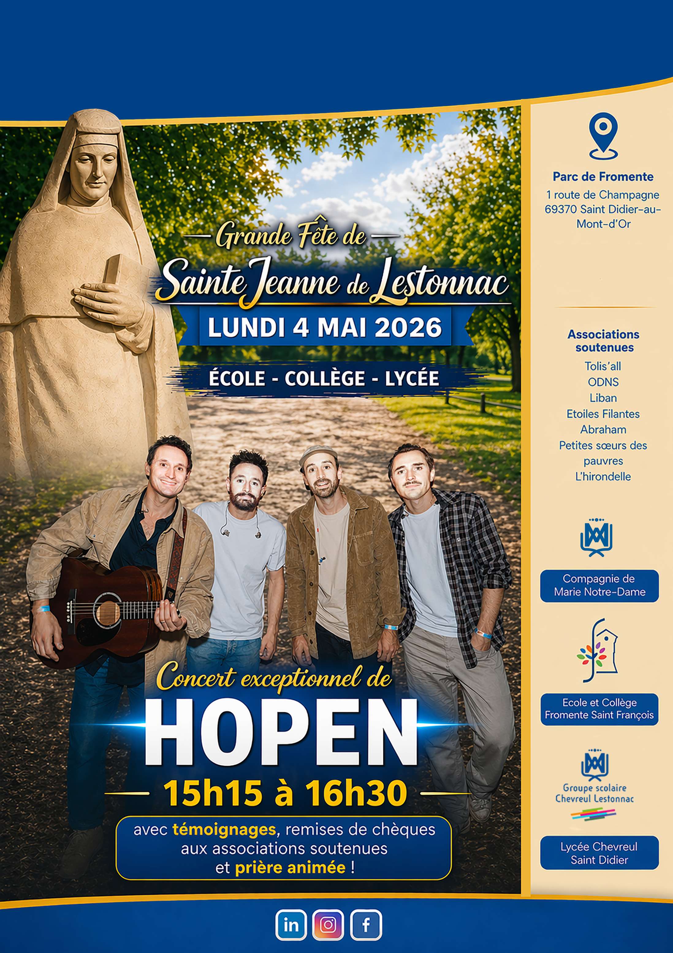 Cet événement mobilise l’ensemble des équipes éducatives, des personnels et des partenaires de notre lycée Chevreul Lestonnac, mais également de l’établissement Fromente Saint François (école et collège) présent sur le même territoire scolaire. Différentes activités sont proposées aux élèves en amont du concert (loto, découverte de la vie de Sainte Jeanne de Lestonnac, jeux en bois), avant de nous réunir au Concert d’Hopen.